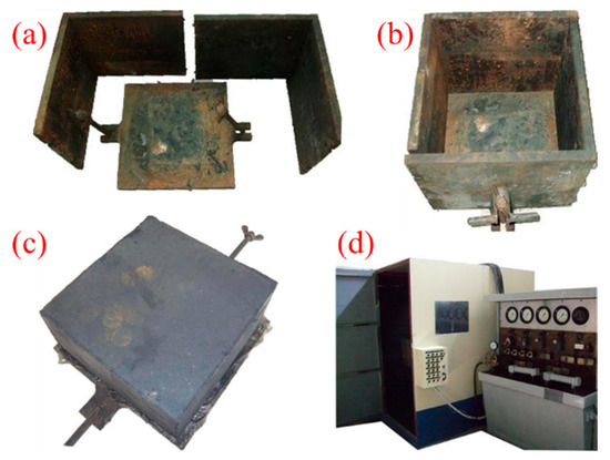 Specimen processing and equipment: (a) decomposed mold; (b) assembled mold; (c) specimen; (d) water jet test and control system.
