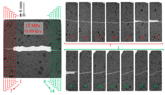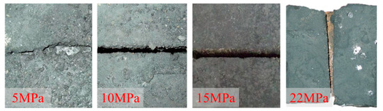 In Figure 10, it can be clearly seen that various coal fragments peeled off from the edge. When the water jet pressure was low, the shape of the slot was relatively complete. As the pressure increased, the fragment peel-off also increased and the shape of the slot became more uneven. The specimens slotted by 15 MPa (0.09 m/s) and 20 MPa (0.12 m/s) were not split into two parts, but cracks existed at the ends of the slot inside the specimen, and formed a splitting trend.