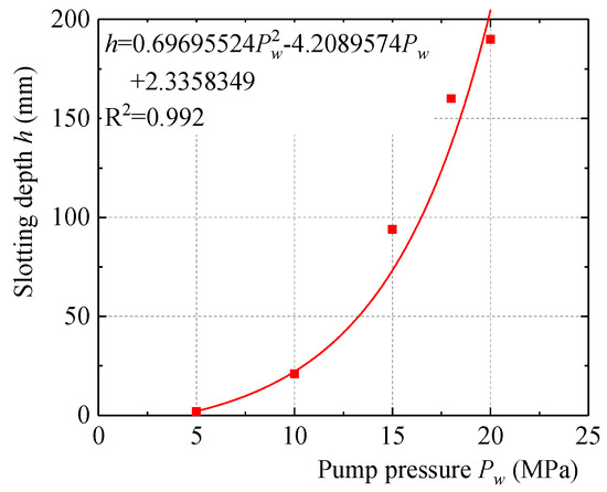 In the experimental investigation of the water jet pressure, the slotting speed was set to 0.12 m/s; the slot shape is shown in Figure 7. As can be seen, the slot width did not change significantly with different water jet pressures, and was approximately 15 mm. However, the slotting depth greatly varied with the change of water jet pressure. When the water jet pressure was 5 MPa, only shallow grooves were crushed on the specimen’s surface. When the water jet pressure was 22 MPa, the specimen was slotted into two parts. Mainly because the impact force of the low-pressure jet was weak, the energy generated by the water jet could not reach the threshold required for coal destruction, and the slot depth was shallow. When the jet pressure exceeded the damage threshold, the depth of the slot increased significantly. Moreover, the transverse movement provided the jet with transverse velocity, and thus the water jet flow exerted a transverse shear force to the coal and aggravated the coal destruction. However, when the impact depth of the water jet reached a certain level, the water in the slot formed a cushion, which attenuated the jet energy and velocity, and thus rendered the water jet incapable of damaging the coal. In other words, the ultimate depth of the water jet slot was reached. Owing to the limited experimental conditions, a deeper slot depth could not be obtained in this experiment. The slot depth h and water jet pressure Pw are fitted in Figure 8. According to the data obtained, the slot depth and exposed area increased within a certain range with the water jet pressure, which indicates a quadratic positive correlation.
