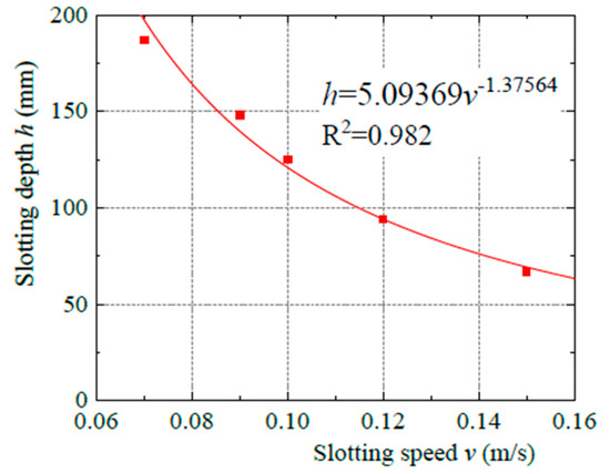 The transverse slotting speed is the rotation speed of the drill bit during water jet slotting. When the water jet pressure was 15 MPa, the speed became faster, and the slot became shallower. When the transverse speed was 0.09 m/s, the specimen was deeply slotted. When the transverse speed was 0.06 m/s, the specimen was slotted through. Moreover, the transverse speed had a minor effect on the slot width, which was approximately 15 mm. The slot depth h and traverse speed v are fitted in Figure 9. Within a certain range, the slot depth and exposed area decreased as the traverse speed increased, and the decay rate became progressively smaller.
