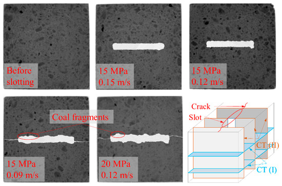 To observe the crack morphology, CT (type II) scanning was carried out at the end of the slot at 6-mm intervals as shown in Figure 11. The crack was essentially a vertical crack, and the propagation direction was the water jet transverse direction. Additionally, certain distortion existed in the crack propagation process, which increased the coal’s permeability. This indicates that, as the hydraulic slotted pressure increased, the slotted time became longer, and new cracks were more likely to form. Therefore, the water pressure could appropriately increase, provided that the peeled-off coal did not block the hole. The results revealed that the slotting time and pump pressure were the main factors affecting crack development.