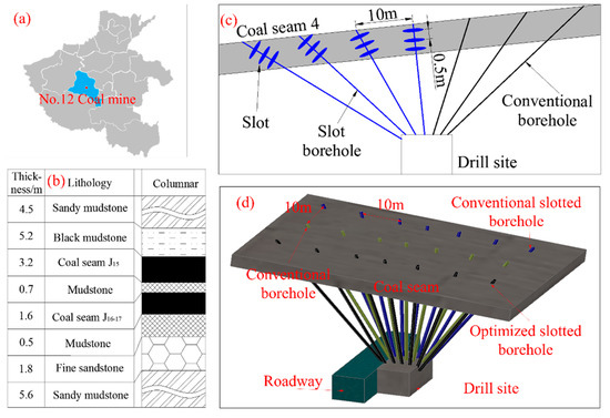 Detailed description of test site and borehole layout parameters: (a) location of No. 12 Coal Mine; (b) geologic column; (c) plan sketch of boreholes; (d) schematic diagram of boreholes.
