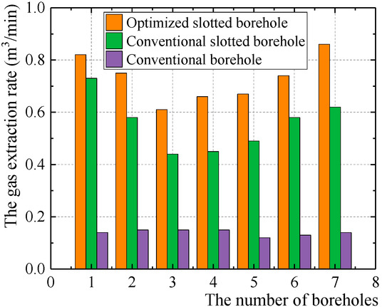 Moreover, it was found that a borehole with a small angle to the coal seam had a high gas drainage flow, mainly owing to the angle between the water jet impact direction and the coal bedding. An appropriate angle between the cleats and borehole makes it easier for cracks to form on both sides of the cleats, and increases the coal seam permeability. The results revealed that the slot greatly increased the coal seam permeability and enhanced the extraction effect. Additionally, the extraction rate of the optimized slotted borehole was higher, which confirms the results of the aforementioned analysis.