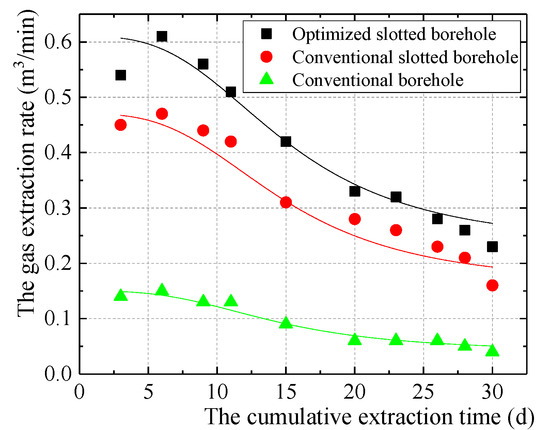 As shown in Figure 13, the extraction rate of the optimized slotted borehole was 1.3 times that of the conventional slotted borehole, and the extraction rate of the conventional slotted borehole was 3.8 times that of the conventional borehole. The average gas extraction rate of the optimized slotted borehole, conventional slotted borehole, and conventional borehole was 0.73 m3/min, 0.55 m3/min, and 0.14 m3/min, respectively. The average gas extraction rate over one month was calculated as shown in Figure 14. The variation trends of the gas extraction rate were approximately the same for the two borehole types. The trend gradually decreased as the extraction time increased, and the reduction rate gradually decreased. According to the overall trend, the gas extraction rate after slotting was always higher than that of the conventional borehole, which was approximately 3–4 times equal that of the conventional borehole.