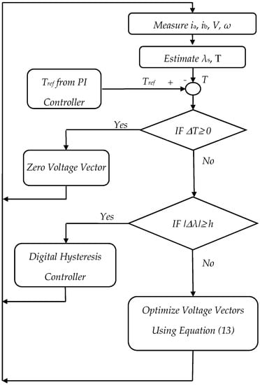 A block diagram of the control system of Method (2) is shown in Figure 3. It is the same as that of Method (1) except there is no rotor flux observer and the optimization Equation (13) is replaced by Equation (21). The whole control system is working with digital signals and given sampling time. The controller inputs are the measured currents and DC link voltage. Simple estimators are implemented for the stator flux and torque. However, another estimator for the rotor flux angle is required for Method (1). A detailed flow chart for the control algorithm of optimization Method (2) is shown in Figure 4. The block diagram in Figure 3 represents proposed control Method (1) with the dashed arrow for the rotor angle (). Additionally, the control flow chart of Figure 4 is typical for Method (1) except for the estimator of () and the optimization Equation (21).