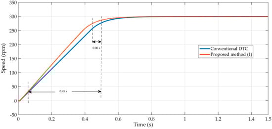 Figure 11 shows the comparison of the speed response of proposed Method (2) and the traditional DTC at different set speed values and torque loads. Changing the set value with the PI controller gives an unacceptable system response [32]. Hence, the PI controller is replaced by an adaptive PI controller in this situation. Seen at all set points, there were no overshoots and no steady-state errors. The settling time differs according to the set value. The step changes of the load torque barely affect the IM speed due to the high performance of the adaptive controller. Figure 11 shows the response of the system using proposed Method (2) and how the response is faster than the traditional DTC response. It is noted that the responses may be typical at some set points. The cause of this phenomenon is that the optimization of the voltage vector is always performed between two vectors inside the hysteresis band. Sometimes the result of the optimization is similar to that given by the traditional DTC. This produces the same speed response in random situations. However, the proposed methods give a response that is equal to or faster than that of the traditional DTC.