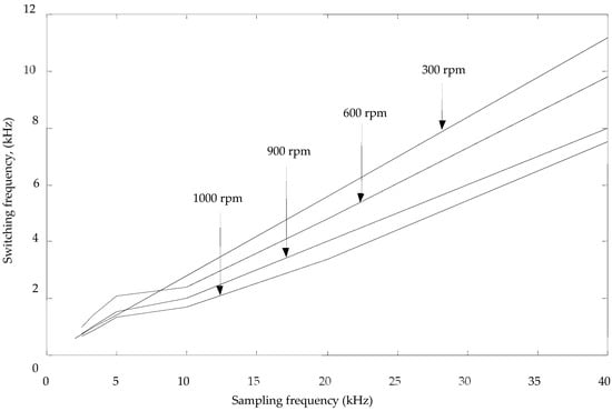 The relationship between the inverter switching frequency and the sampling frequency at different speeds and full load conditions.
