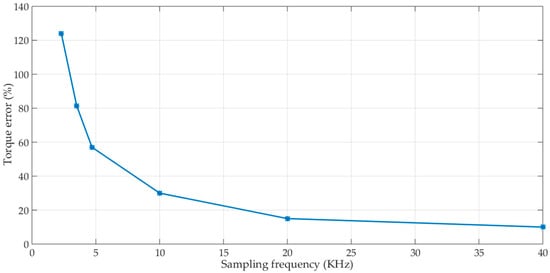 Figure 8 shows the effect of changing the controller sampling period on the inverter switching frequency of proposed Method (1) at different operating speeds and full load conditions. It is clear that, as the sampling frequency increases, the switching frequency increases. However, the traditional DTC has a variable frequency. Its average value at full load conditions was nearly 200% of proposed Method (1). Hence, the switching losses and system efficiency of the proposed systems are better than the traditional DTC. The relationship between the IM torque error and the sampling frequency is shown in Figure 9. The figure indicates that the torque error can be reduced by increasing the sampling frequency. Conversely, the switching frequency will increase if the sampling is increased.