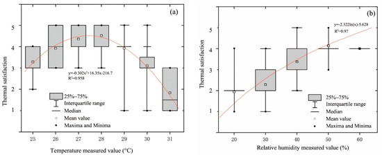 The relationship between the measured temperature and relative humidity with thermal satisfaction. (a) Temperature, (b) relative humidity.
