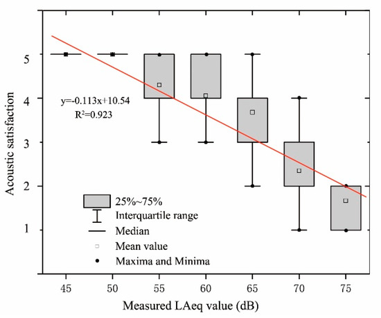 The relationship between the measured equivalent continuous A-weighted sound pressure level (LAeq) and acoustic satisfaction.