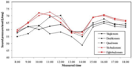 Figure 3 provides the measured LAeq over the test period with different ward capacities. Since the density of patients and the size of the space affect the indoor thermal and acoustic environment, we investigated wards with different numbers of beds. It should be noted that the environmental noise in six-bed rooms and eight-bed rooms were higher than that in single, double, and quod rooms. This indicated that the patient density had a significant impact on environmental noise, which is consistent with a study of an underground commercial street [39]. The noise level of each ward starts to rise at 8:00 and becomes relatively quiet from 12:00 to 14:00 because of the lunch break. The peak noise at 70–75 dB occurs from 9:00–11:00 and 15:00–17:00, and this level of noise can be annoying or uncomfortable. As in previous studies, more occurrences of noises with longer duration were observed in multiple-bed wards, as compared with single-bed wards [40]. This indicates that the measurement results of the acoustic environment were similar to those in different climate regions.