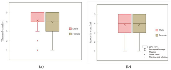 The gender difference on thermal and acoustic comfort. (a) Thermal, (b) acoustic.