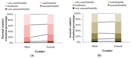 The percentage of comfort evaluation for different genders. (a) Thermal, (b) acoustic.