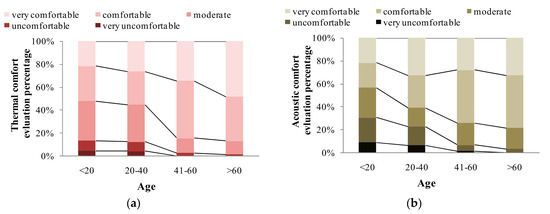 The percentage of comfort evaluation for different ages. (a) Thermal, (b) acoustic.