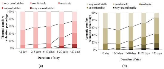 The percentage of comfort evaluation for different durations of stay. (a) Thermal, (b) acoustic.