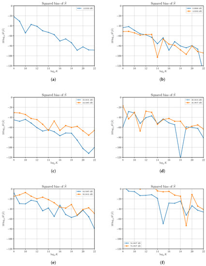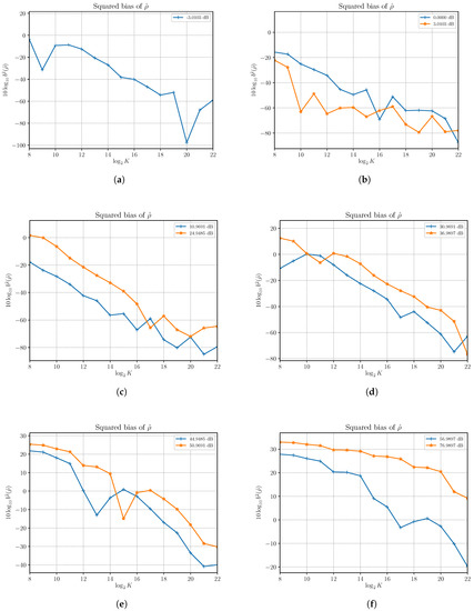First, we verified that is asymptotically unbiased, as expected from first-order approximation analysis. Results of simulations run at different SNRs show that the estimated squared bias is very small even with a small number of observations. As an example, we report in Figure 1 the estimated squared bias for at different SNRs obtained by increasing S and with . Though the squared bias grows with increasing S, and then with the SNR in this case, it can be made quickly very small by increasing the number of observed samples. Some bias is noticeable at high SNR; e.g., for 76.9897 dB with a low number of samples.