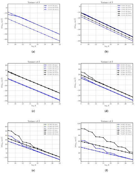 In Figure 6c,d we show results for SNRs within the range from 10.9691 dB to 36.9897 dB. The estimated variances reach the corresponding asymptotic variances, though a greater number of samples is needed. In this case we see that the difference between the estimator’s variance and the corresponding CRLBs increases as S increases. Note that as the SNR increases the dominant term in (23) becomes