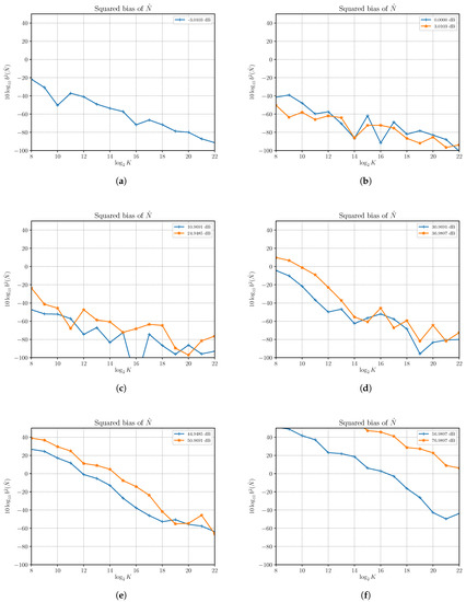 In Figure 5 we show the estimated squared bias of the SNR estimator as a function of the number of observations K at different SNRs, obtained by changing S with . Results reveal that, in certain cases, the SNR estimator exhibits some bias that depends on both S and N to be estimated and the number of samples observed over which the estimate of the SNR is computed. In fact, for a sufficiently large number of observations, the squared bias can be made very small, even if that means that for high values of S the number of observations required for an unbiased estimator is very large; e.g., with an SNR of 76.9897 dB the squared bias is still greater than one with observations.
