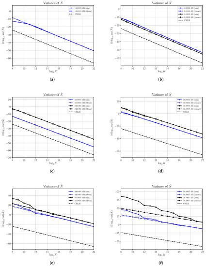 While the noise power estimator is asymptotically consistent in all cases, it is not efficient, since it cannot achieve the CRLB, in all cases under investigation. The difference between the asymptotic variance and the CRLB remains constant as the number of samples increases and depends on the current value of the signal power S. In Figure 4b we note that the difference decreases as S increases; e.g., for a given K the asymptotic variance of with an SNR of 3.0103 dB is closer to the CRLB than the asymptotic variance of at 0 dB. On the other hand, in Figure 4c–f we see that the difference becomes lager and larger and asymptotic variances of the noise power estimator are quite faraway from the CRLB. In other words, though the estimator is consistent, it may require too many samples to get acceptable performances. Moreover, it is not asymptotically efficient since the asymptotic variance is not superimposed to the corresponding CRLB.