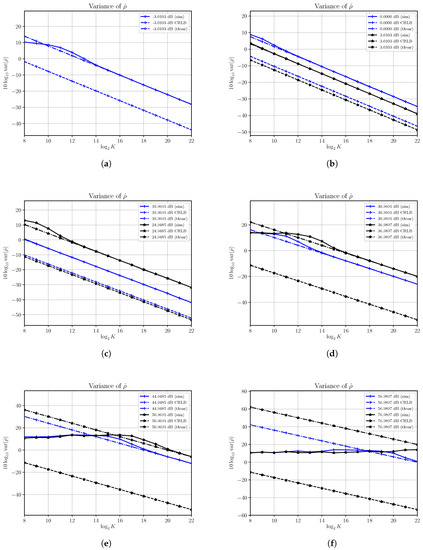 In Figure 4 the estimated variances, denoted with (sim), along with the corresponding asymptotic variances, denoted with (theor), and CRLBs, at different SNRs are shown. Note that the CRLB of (17) depends on only and in the figures remains constant as, also in this case, the increase of the SNR is obtained by increasing S while the noise power remains constant with . Variances are reported on a logarithmic scale as versus the , where K is the number of observed samples.