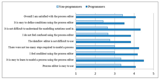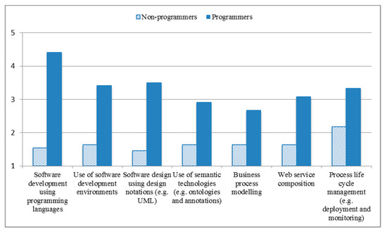 Participants rated their software development background and experience on a 5-point Likert scale, where 1 signifies ‘Extremely poor’, 3 signifies ‘Average’, and 5 signifies ‘Excellent’. All background scales showed excellent reliability (Cronbach alpha > 0.92). We calculated an average index of the background questions and performed an independent-samples t-test to assert differences between non-programmers’ and programmers’ development experiences. Results showed a statistically significant difference between users’ development skills and experience depending on their background, t (21) = 4.79, p < 0.001. Non-programmers’ software development experience and service composition skills (M = 1.67, SD = 0.30) averaged significantly lower than programmers’ (M = 3.33, SD = 0.18) for all measures, as depicted in Figure 1.