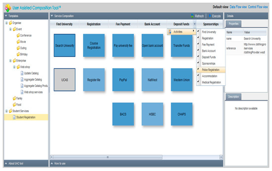 The User Assisted Service Composition Tool is a specialized plug-in developed to empower non-programmers to compose services by simply customizing design templates, without the need to model processes manually or write programming code [21]. We refer to this as parametric design using templates or assisted composition. This tool offers a high level of design support to the end-user. The end-user in this case does not specify the logic, control flow, or data flow of the composite service as this is handled by the tool itself using artificial intelligence techniques [21]; (s)he only needs to customize the relevant design template (from the left menu) to create a service composition. Design templates are goal-oriented, pre-defined service compositions containing a list of activities and corresponding services organized in a tabular manner (see Figure 3). Each design template exists to achieve a particular user goal and consists of activities which are essentially actions/steps that contribute to fulfilling that goal. Each of these activities may have a choice of competing services to achieve the activity. For example, the “Student Registration” template enables new students to register for a university course and includes the following activities/steps: “Find University,” “Registration,” “Fee Payment,” “Bank Account,” “Deposit Funds,” and “Sponsorships.” The Fee Payment activity; for instance, can be achieved via either of these services: “PayUniversityFee,” “PayPal,” or “BACS.”