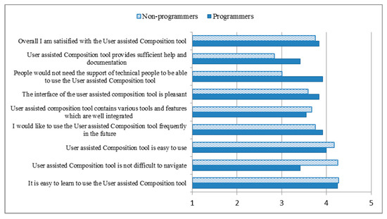 Due to their poor software development experience, non-programmers should regard assisted composition (i.e., assisted template-based design) as easy to use and satisfying [19,20,21,22]. This is because it requires little cognitive effort to operate and is close to their mental models. However, programmers are expected to regard assisted composition as inflexible, constraining, and lacking power to express complex application logic [14,18]. Consequently, our hypotheses pertaining to assisted composition are as follows: