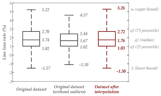 - The deviations of outliers in the dataset are sometimes extremely away from normal values, indicating the low dependability of the acquisition and communication equipment. According to Table 1 and Figure 2, the lower and upper bounds of the original dataset in the box-plot are −1.57% and 5.22%, respectively, which is quite close to the project standard (−1% and 5%). However, the maximum and minimum of the collected line loss rates are 100% and −1.69 × 106%, respectively; greatly different from the bounds. In this case, benchmarking line loss rates is still necessary nowadays in practicable applications.