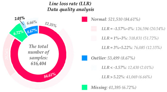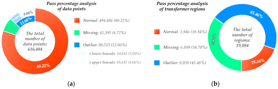 Based on the proposed RNN, the pass percentage results of line loss rates can be analyzed, which are shown in Figure 12. For the data point analysis of line loss rates, the number of outliers are more than that in Figure 3, as the proposed method is able to precisely identify those outliers that are greatly different from the benchmark values. Furthermore, although the percentages of missing values and outliers are not relatively big in all data points, which are 6.72% and 13.06%, respectively, the regions that possess no missing and abnormal values within a month only occupy 19.84% of the whole dataset in the study, indicating a low reliability of the current acquisition equipment.