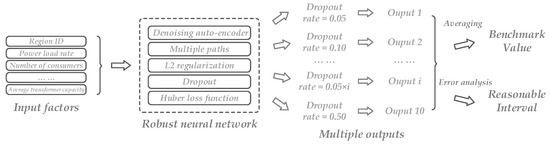 As mentioned before, an RNN is used in this study for robust learning, whose architecture is provided in Figure 7. It is made up of three main paths which are combined by concatenation, where there is a DAE on each main path. The concatenated output nodes are placed in a same layer, which represent high-order features extracted from original inputs. For the further improvement of robustness, L2 regularization is utilized in this layer to limit the output values of those nodes. Then, ten dropout layers with different dropout rate are stacked after the high-order feature layer, where ten outputs can be obtained. The ten outputs are analyzed to calculate the benchmark value and reasonable interval, as introduced above in Section 2.3.