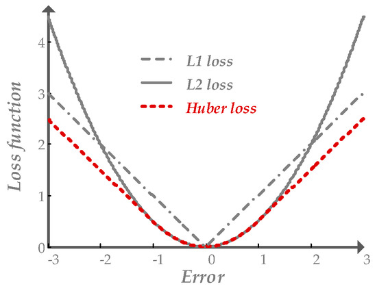 Comparing MSE and MAE, MSE holds a smoother derivative function, which can benefit the calculation of gradient descent algorithm, whereas a small difference in MAE may cause a huge change in parameter updating. On the contrary, MAE demonstrates a better capability than MSE when fighting against outliers [35]. In this case, a Huber loss function is applied in this study that combines the merits of both MSE and MAE [36], as shown in Figure 10: