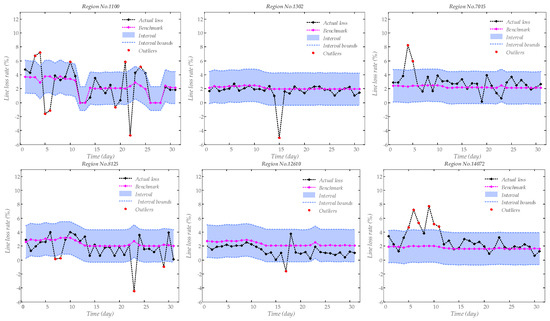 In the case study, six regions from testing samples are chosen randomly as examples for exhibition, which are shown in Figure 11. Their region IDs are 1100, 1302, 7015, 8125, 12,610 and 14,072, respectively. From the results, the bounds of reasonable intervals can adjust adaptively according to multiple input factors, especially in Region No. 1100 and Region No. 8125. Some outliers that are far away from benchmarks are efficiently picked out, although those outliers may stay between −1% and 5%. Hence, the results of reasonable intervals are better than a fixed interval between −1% and 5%. Besides, the benchmark values show less fluctuation the actual line loss rate values, indicating a high reliability to estimate daily line loss rates. Rather than a mean value or a median value calculated from the original dataset, benchmark values are able to adaptively reflect the daily operating conditions in transformer regions according to the changes of relevant factors.