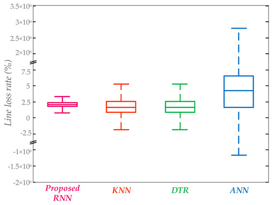 In order to evaluate the robustness of the proposed method, the distributions of the calculated benchmark values based on different testing models are analyzed, as shown in Figure 13. The detailed values of the distribution indictors are presented in Table 6. From the results, the testing ANN model shows the worst performance and is totally unable to calculate a valid benchmark value. The maximum and minimum values from the ANN are 4.49 × 106% and −8.26 × 107%, respectively, which can hardly be applied as benchmarks. KNN and DTR obtain similar results according to the distributions. They both utilize massive training samples that are close to the situation of an unknown testing region to decide new benchmark values. Thus, they are able to receive a better robustness than ANN in the study and are practicable at most of the testing regions. However, the minimum benchmark of the two models is −8.13 × 104%, which is still not a reasonable value. Furthermore, the proposed RNN achieve the best result among all the four testing models, where the calculated benchmark values are within a reasonable range. The standard deviation of the benchmark values calculated by RNN is only 0.80%, indicating a stable and robust result obtained via the proposed method.