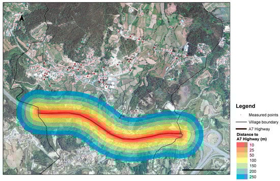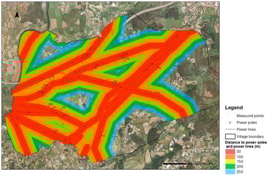 For the “exposed” group, 32 measurements were performed, with projected distances varying between 1 and 250 m, and in several points in the village of Serzedelo (Figure 3).