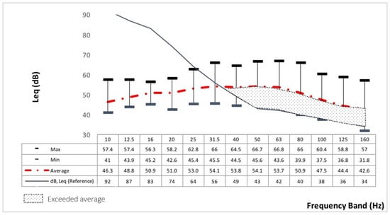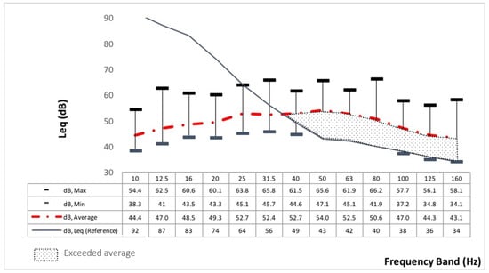 In previous studies, the authors took measurements without interference from road sources [31]. The results showed that for the “exposed group”, and using 26 isolated points, without interference from traffic road sources, the noise levels were exceeded for all points measured between 50 and 160 Hz and the mean exceeded recorded in this group was 55.7 dB. For the “unexposed” group (21 points), the measured noise levels were exceeded at all points between 50 and 80 Hz. The mean of the exceedance, for this group, was 50.1 dB.
