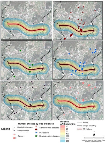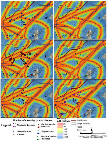 The high percentages for cardiovascular diseases, depression and sleep disorders may be caused by exposure to low-frequency noise. The population of the village of the “exposed” group may suffer more from influence due to exposure to the noise emitted by high voltage power poles and power lines (added to that emitted by sources other than the study source, such as traffic road noise), rather than the presence of the electromagnetic field emitted by these infrastructures. Concerning the association between distance to the highway and the presence of health problems, there is no clear pattern in the spatial distribution of disease in the villages of the “exposed” (Figure 5) and the “unexposed” (Figure 6) groups. We also find it complex to establish a spatial distribution pattern of the diseases in Serzedelo due to the presence of power poles and power lines in more than 80% of the territory (Figure 7).