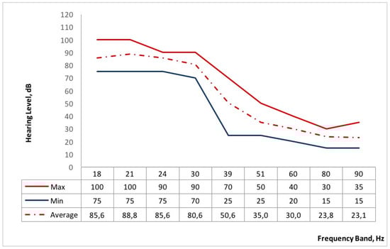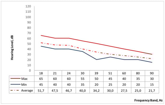 The differences recorded for the hearing threshold for pure sounds and recorded sound for both groups were significant. For the recorded sound, the difference between the average of the hearing threshold was 27.2 dB [54]. The data shows that the “exposed” group revealed being used to low frequency noise, and corroborates the results shown in Figure 6; Figure 7, which clearly illustrates the low sensitivity of the “exposed” group below 39 Hz when compared to the “unexposed” group [54].