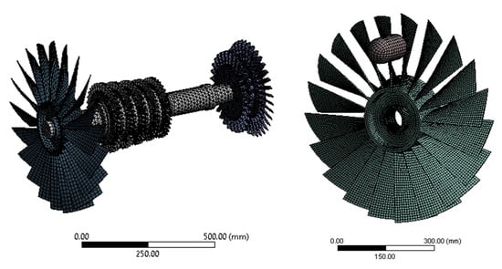 The simplified approach of the one- and two-dimensional elements can be used in many cases, but the use of three-dimensional elements is the best method to achieve the goals of a dynamic analysis [14]. One of the advantages of using three-dimensional elements is to directly develop a finite element model of the rotating component rather than using any other mathematical approximation. The 3D elements can also address the non-linearities introduced in the rotor system of asymmetric rotors [15], and can also ensure the accuracy of the structure [16]. The asymmetric rotor can be because of the blade-off condition due to bird strike, or it can also be due to the loss of an entire blade. Another advantage of using a 3D element is that the gyroscopic effects of a rotating system can also be studied. Therefore, the use of a 3D element is the most viable solution to determine the critical frequencies of a rotating component [17].