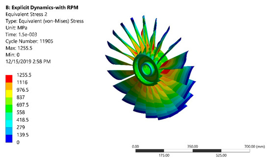 The von Misses stress generated on the blades of the fan against the bird strike are shown in Figure 6, and the von Mises stress generated in the fan blades due to the bird strike was 1255 MPa.