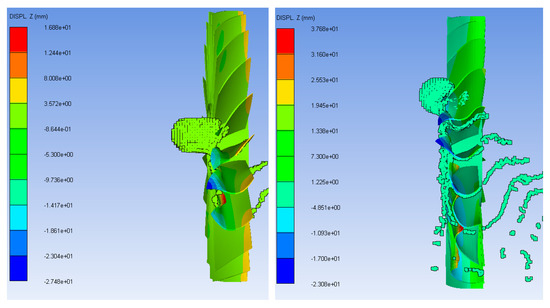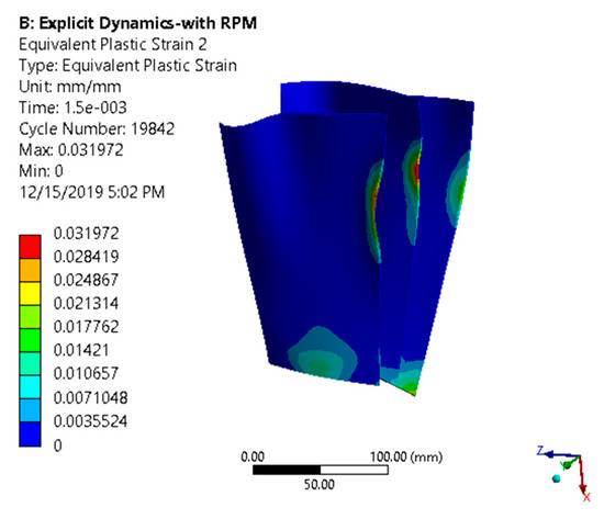 The initial velocity of the bird was 77.2 m/s. The initial velocity was according to the take-off speed of a commercial airline aircraft [22]. The bird was aimed at 60% of the mid-span of the blades, as per the probability equations for a bird strike on an engine rotor [23]. The bird was positioned close to the fan blades to reduce the computation time. The deformation of blades is shown in Figure 5.