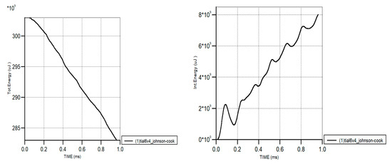 The blades of the rotor were meshed using QUAD elements of the SOLID 185 element type, whereas the shaft was modeled using the TETRA element of the SOLID 185 element type. Several analyses were performed in order to avoid any result discrepancies due to mesh sensitivity. In these analyses, the elements through the thickness and along the length of the blades were increased so as to notice any improvement in the results. However, no further improvement was noticed, but an increase in the computational time was significant. Therefore, the total elements in the FE (Finite Element) model were 62,480 and the total number of nodes were 25,966, with at least three elements though the thickness of the blade. The bird strike simulation was performed using the explicit dynamic solver of ANSYS. In the explicit dynamic solver, the time step is defined by the smallest element in the FEA (Finite Element Analysis) model. This solver uses the principle of energy conservation to check the solution accuracy. The overall energy of the system at each cycle was calculated, and if the energy error reached a certain threshold, the solution process terminated. By default, the threshold level was 10% of the reference energy [19]. In the simulations presented, the energy error did not reach its threshold value. The energy error may occur due to the tensile instability in the elements, as a result of the interactions of the Kernel function and the constitutive relation of the FEA model [22]. No such tensile instability was noticed within the response time of the simulation. This response is also compatible with the observations of other researchers working using SPH techniques [30,31].