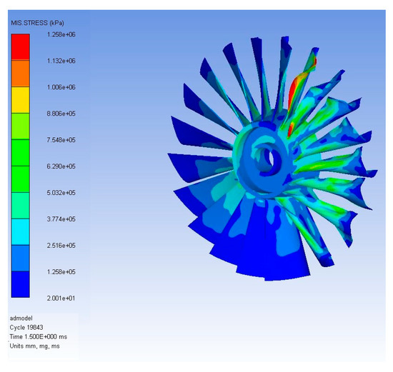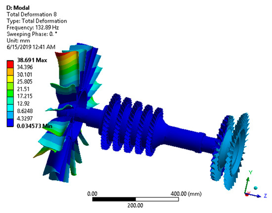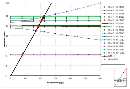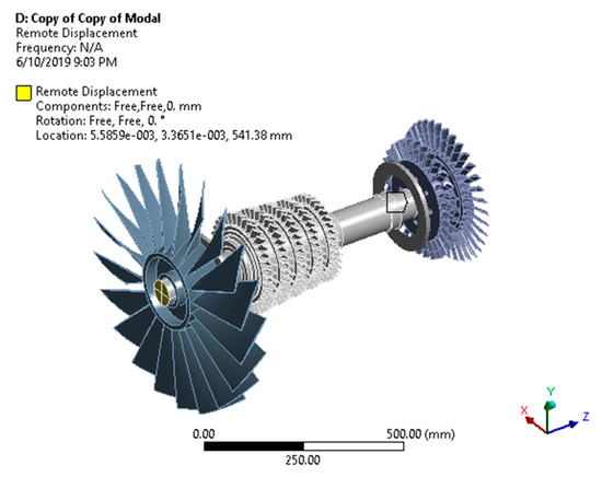 The centrifugal forces generated in response to the rotation of the engine rotor were the main loads on the rotor. Therefore, the main load was the centrifugal forces generated against the 18,000 RPM. In the case of complex turbulent structures, Coriolis forces can also impact on the performance of the rotor, and can also add an unbalanced force into the rotor system [32]. As far as the loading conditions were considered, the load was increased stepwise in eight load steps. Gradually, the load was increased on the rotor from 0 to 21,000 RPM, with increments of 3000 RPM in each load step. As the axis of the rotor was along the global Z-axis, the load was applied only in a Z direction.