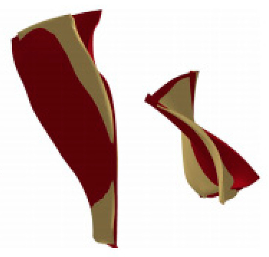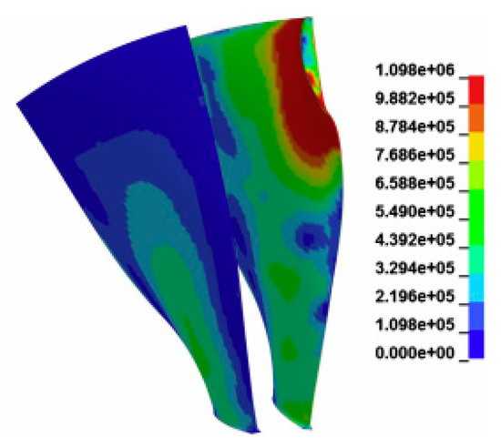 Also, the stress plot of this study is compared with stress plots from study carried out by Vignjecic et al. [22]. The von Misses stress in this study is nearly 1255 MPa whereas the stress levels in study carried out by Vignjecic et al. is 1098 MPa. This may be due to difference is rotating RPMs. In this study the rotational velocity for engine rotor is 1885 rad/s whereas, in Vignjecic et al., has taken 806 rad/s as rotational velocity in their study [22]. Figure 6 and Figure 9 present the von Misses stress plots of this study, whereas, the von Misses Stress plots from the Vignjecic et al. study are presented in Figure 13. The superimposition of the deformed blade from the experiment on a deformed blade from the simulations by Vignjecic et al. is presented in Figure 14.