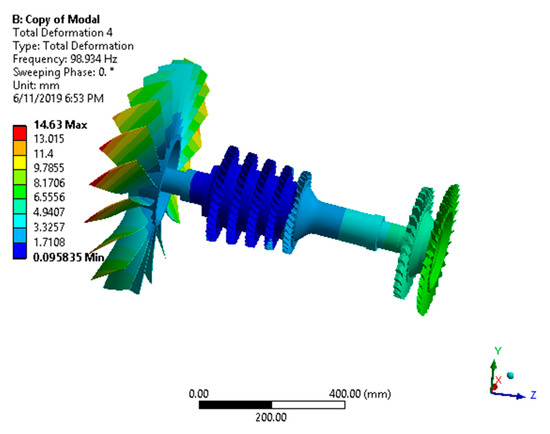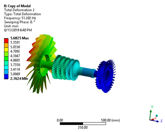 From Table 4, we can observe that all of the extracted modes were stable. It can be observed that before the bird strike event, the first forward whirl critical mode was excited at 3074 RPM. The second forward whirl critical mode was excited at 6405 RPM. It is noted that as the load step RPMs increased, the forward whirl frequencies increased and the backward whirl frequencies decreased. The deformation plots of the first conical and first bending mode before the bird strike event are shown in Figure 17 and Figure 18, respectively.