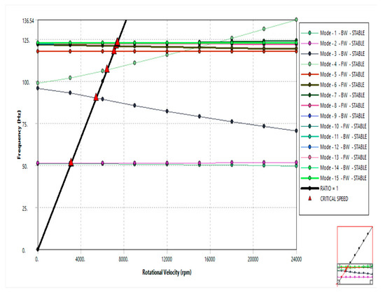 In this case, the eigenvalue frequencies were obtained for the jet engine rotor at a rotational speed from 0 to 21,000 RPM at different load steps, using increments of 3000 RPM in each increasing load step. A comparison of the critical frequencies before and after the bird strike is shown in Table 4.