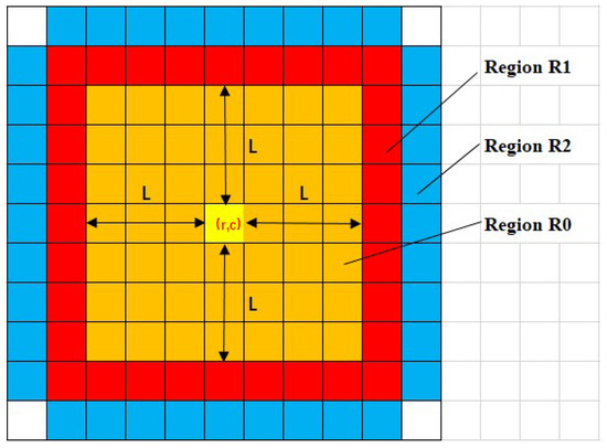 where and represent pixels of the first and the last columns in R1, and and are the pixels of the first and the last rows in . Equation (5) indicates that each corner element in has been compared two times, so the total number of pixels in (4) is given by Card() + 4 rather than Card().
