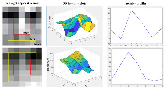 Next, to further remove false targets, the statistics of sub-regions , and are calculated. For real small IR targets, their intensity might not strictly meet the Mexican-hat distribution. For example, the first row of Figure 4 shows that the center pixel of a target is not the brightest, and the second row shows that nearly half of pixels in region and in region don’t meet the Mexican-hat distribution. Therefore, for a candidate target located at (r, c), (3) is adopted to calculate the ratio of the number of pixels in being darker than the mean intensity of to the total pixels of .
