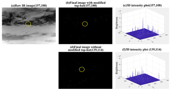 This experiment adopts Seq.2 that has low target-background contrast to evaluate the influence of the modified top-hat transformation. According to [22] as well as our experimental results, we set the parameters of the modified top-hat transformation as , = 1, = 1, = 1.2, = 1.2, and = 5. Here is the window size. , and are the coefficients of target enhancement operation. For the two thresholds of our method, we set and . Figure 5, Figure 6 and Figure 7 show some results with and without modified top-hat transformation. The raw IR images of these figures include a small target located at the edge of clouds, a small target located at the sky background without clouds, and a small target near the edge of clouds, respectively. We can see that the modified top-hat transformation benefits to increasing the contrast between the target and the background. Therefore, the targets with low contrast can be detected easier with such a transformation.