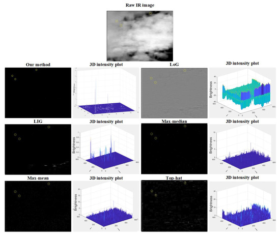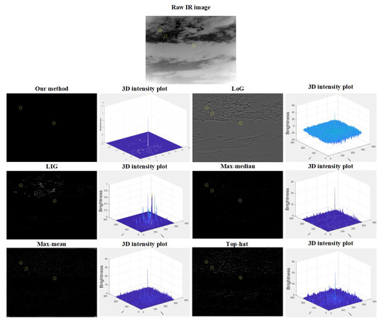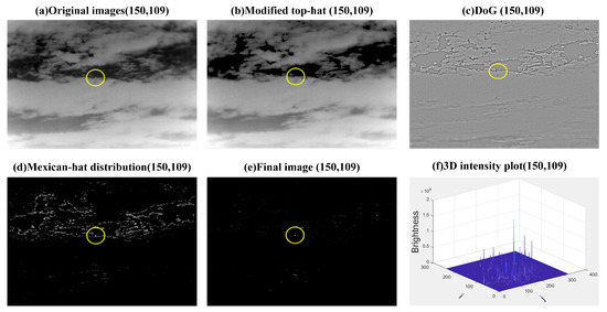 Figure 8c shows that DoG filtering is good at dealing with a synthetic target whose intensity strictly meets the Gaussian distribution. Generally speaking in this case the DoG itself is enough to detect the real target. But Figure 9c indicates that the DoG cannot well deal with real targets which may not have a strict Gaussian distribution. In this case, background clutters like cloud edges may have a similar intensity to a small target after DoG, and thus the simple DoG cannot detect targets correctly. From Figure 9f we can see that in the case of real targets our method still performs well. This is due to the rules based on the Mexican-hat distribution play an important role in enhancing real targets.