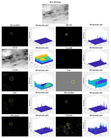 Figure 10 and Figure 11 visually illustrate the detection results corresponding to each method. The final detected target is circled in yellow. An image without any yellow circle means the method fails to detect any target. Here zoomed in images have been presented to see the target clearly.